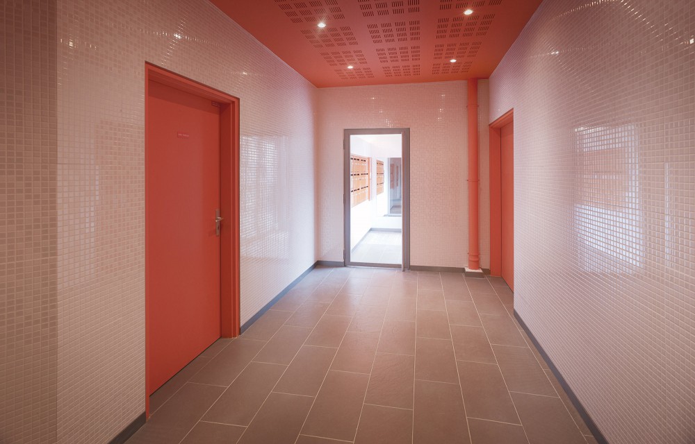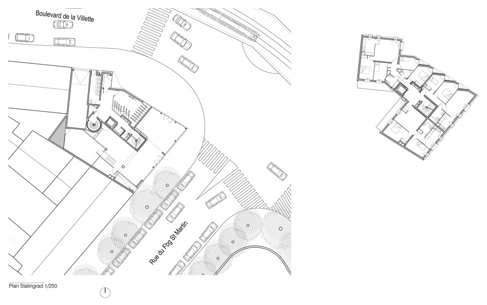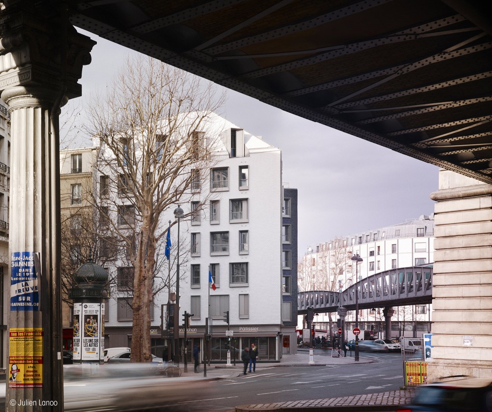 How to mark the core of the Stalingrad quarter in the Paris 19th arrondissement, on the corner of rue du Faubourg Saint-Martin and boulevard de la Chapelle. Situated in a strategic location where avenue de Flandre turns into rue du Faubourg Saint-Martin, this building was built for the Siemp, social landlord involved in the reduction of insalubrity and the metamorphosis of the Parisian suburban fabric. The building takes its place in a neighbourhood in full regeneration, near the la Villette basin opposite the Rotonde de Ledoux. A key project, it marks the corner of the street with its sharp edge. The bakery on the ground floor and the 16 accommodations above it are located at the junction of urban flows: here pedestrians, cyclists, cars and overground metro pass each other, in continuous motion, which creates the whole dynamic of this plot of land that is well known among Parisians. By following the curve of the pavement, the building directs the flow in this piece of the city where the street completely belongs to its residents. The building is almost level with this highly urban environment whilst protecting the privacy of its residents with windows chiselled on the bias, which direct and frame views of the Seine and Loire quays below. The building reflects the kinetics of its neighbourhood due to its faceted geometry and its glazed tile façades. It was developed with the supplier Wienerbeger and the general construction company Tempere Construction, at the request of the Siemp, the project’s contracting authority.
